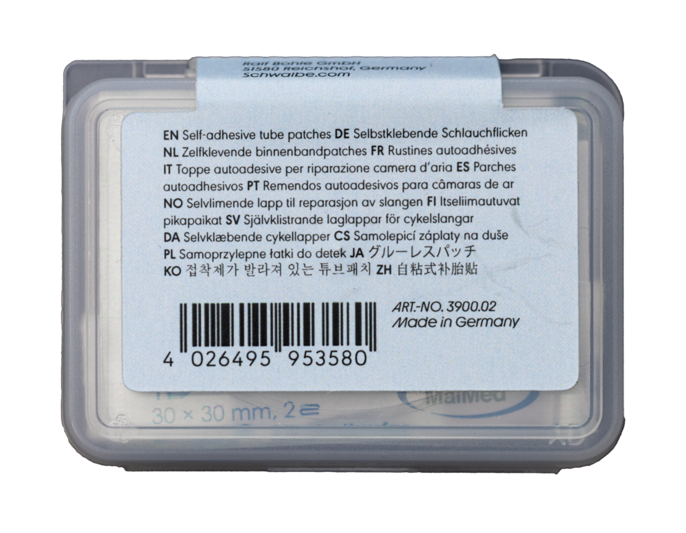 With the self-adhesive patches from Schwalbe, a hole in the Aerothan tube can be repaired quickly and easily. The patches were specifically designed for the repair of Schwalbe TPU tubes.