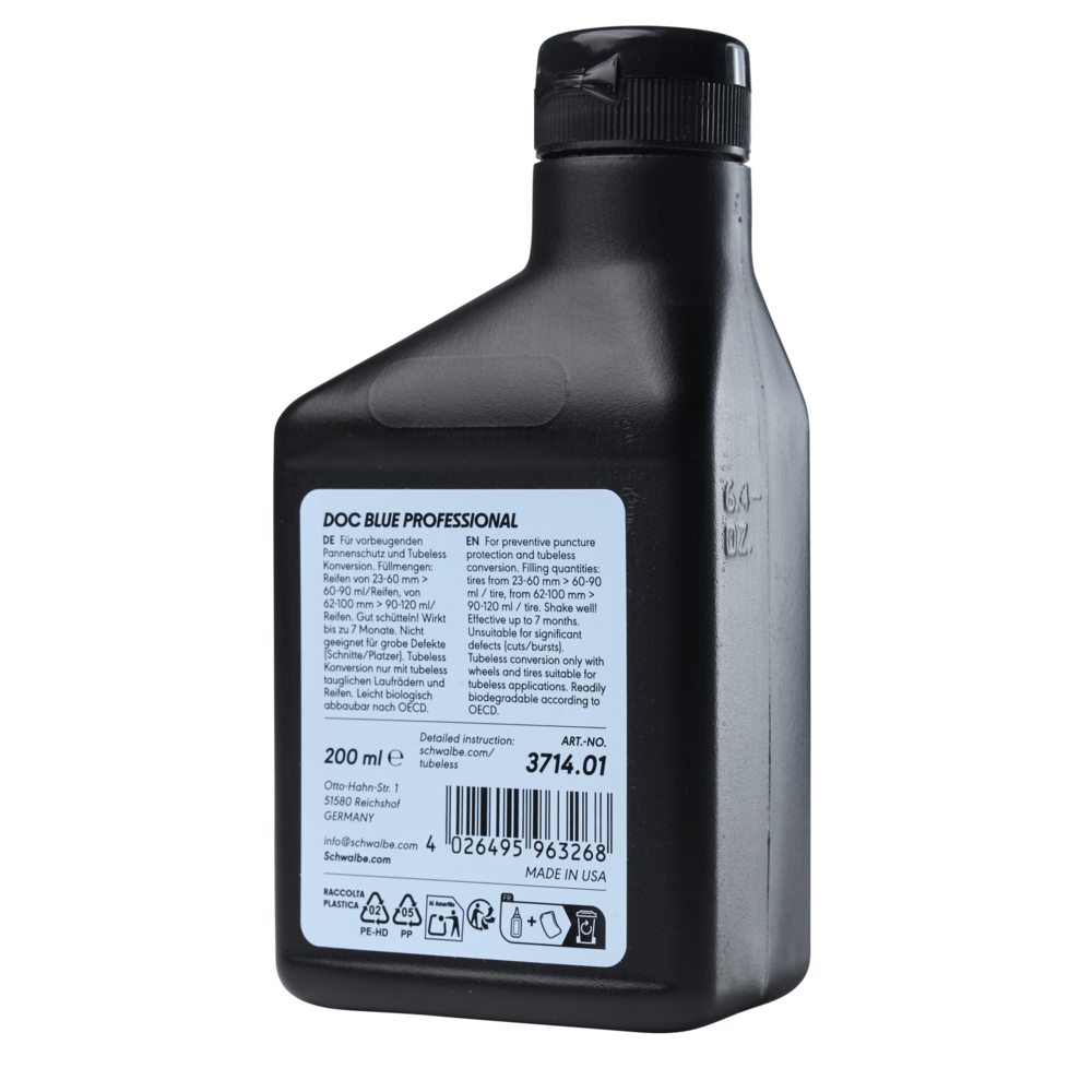 Best suited for tubeless conversion. Doc Blue Professional is our recommendation for use with Schwalbe TLE tires and guarantees easy handling and optimal, fastest sealing.