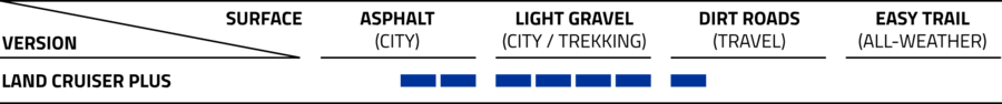 THE LAND CRUISER. As ever it‘s ready for any terrain. It rolls really easily on the road and yet easily handles any forest or country road. It is excellently protected by the 3 mm thick Puncture Guard (Schwalbe Protection Level 5). In the “Plus”-version Land Cruiser is a recommendation for E-Bikes up to 25 Km/h.