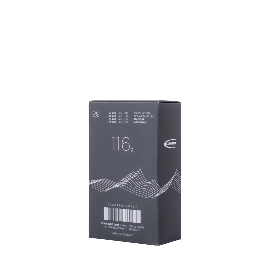 The Schwalbe Aerothan Tube MTB+ with even more volume is just as puncture-resistant against snakebites as it is against sidewall damage - thanks to the extreme robustness of the material. For cross-country and marathon use, the amazingly low weight and low rolling resistance really come into their own. Even on demanding trails, this tube will never let you down: because the Aerothan Tube MTB remains extremely dimensionally stable even at low air pressures, you always have a reliable grip on your bike.