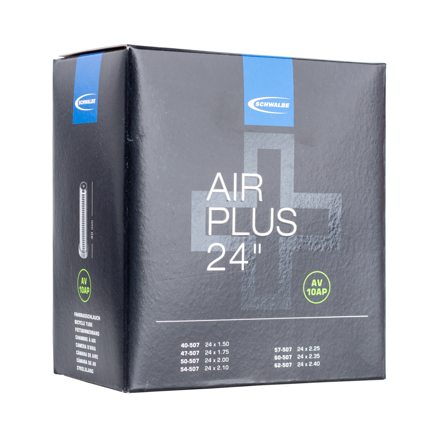 Schwalbe AIR PLUS bicycle inner tube no. 10AP. For bicycle tires in the size 24" inch (ETRTO 40/62-507). Holds the air even longer thanks to wall thickness even longer. Less frequent re-inflation necessary. Also protects above-average protection against punctures.