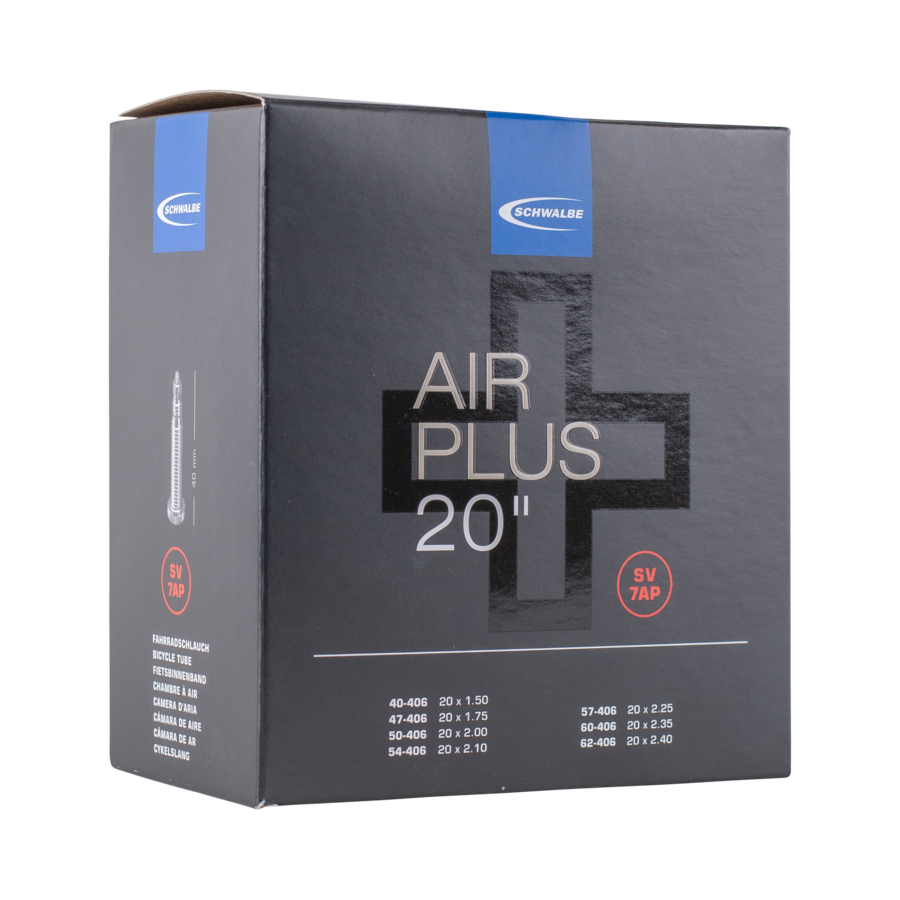 Schwalbe AIR PLUS bicycle inner tube no. 7AP. For bicycle tires in size 20" inch (ETRTO 40/62-406). Holds air even longer thanks to higher wall thickness. Less frequent re-inflation necessary. Also provides above-average protection against punctures.