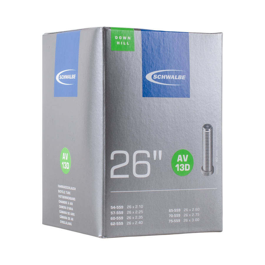 Schwalbe DOWNHILL bicycle inner tube no. 13D. For bicycle tires in size 26" inch (ETRTO 54/75-559). Extremely robust. A reinforced rubber base protects against valve tear-off. Especially for downhill sizes.