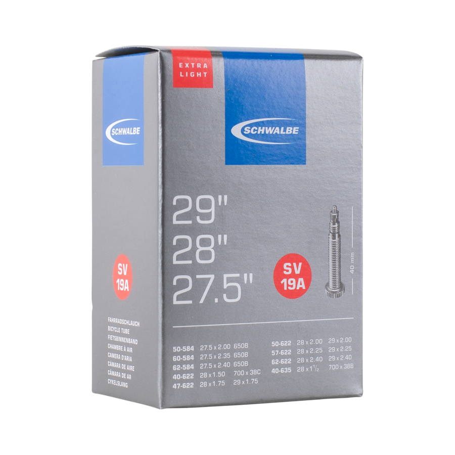 Schwalbe EXTRA LIGHT bicycle inner tube no. 19A. For bicycle tires in sizes 27.5"/28"/29" inch (ETRTO 40/62-584/635). Lower weight, with the same reliability as a Schwalbe standard tube.