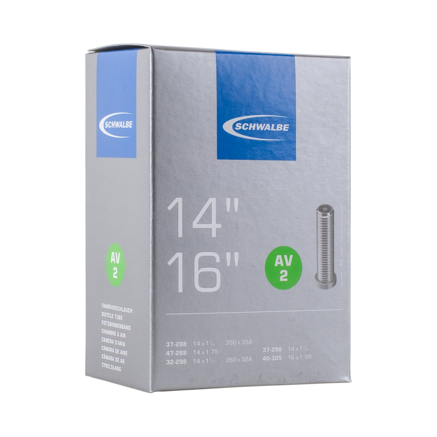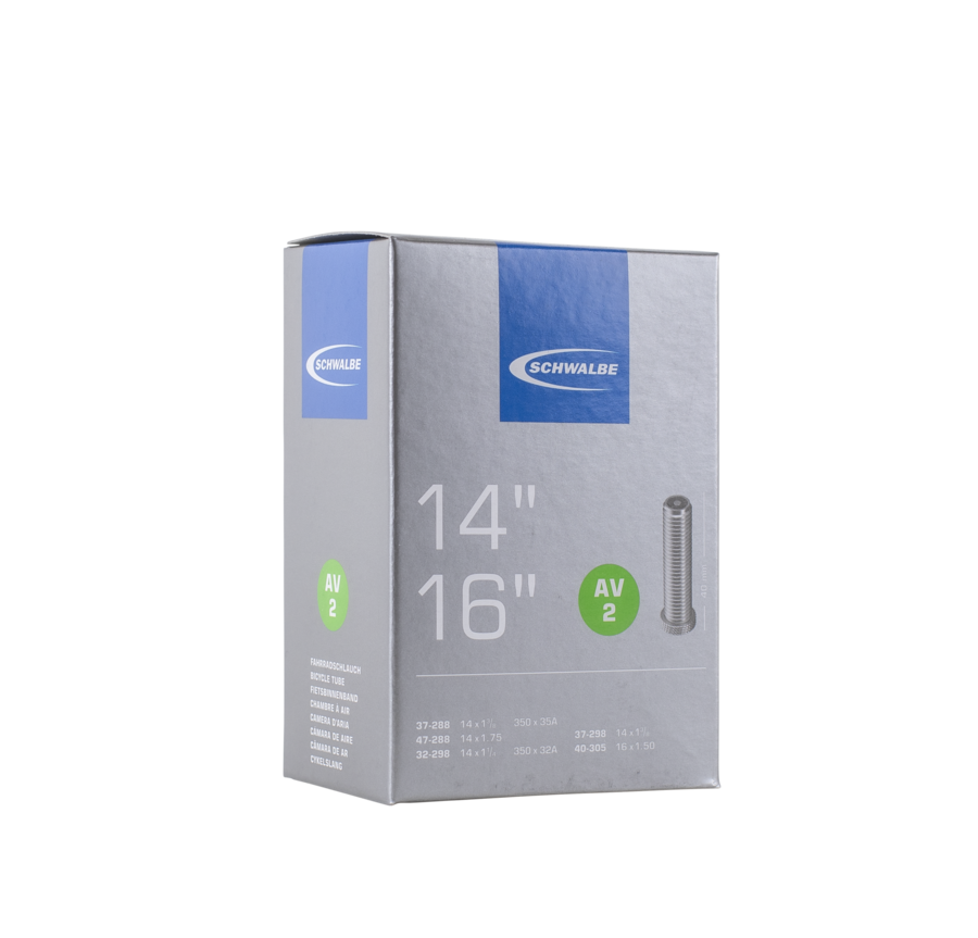 Schwalbe standard inner tube no. 2 for 14" and 16" inch bicycle tires (ETRTO 32/47-288/305). Retains air for an above-average length of time. Thanks to the best material quality and uniform wall thickness. Maximum reliability that has proven itself millions of times over.