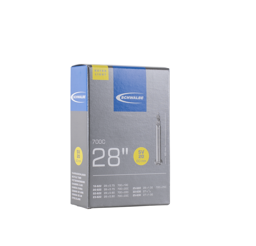 Schwalbe EXTRA LIGHT inner tube no. 20 for bicycle tires in size 28" inch/700C (ETRTO 18/25-622/630). Particularly suitable for road bikes. Lower weight, with the same reliability as a Schwalbe standard tube.