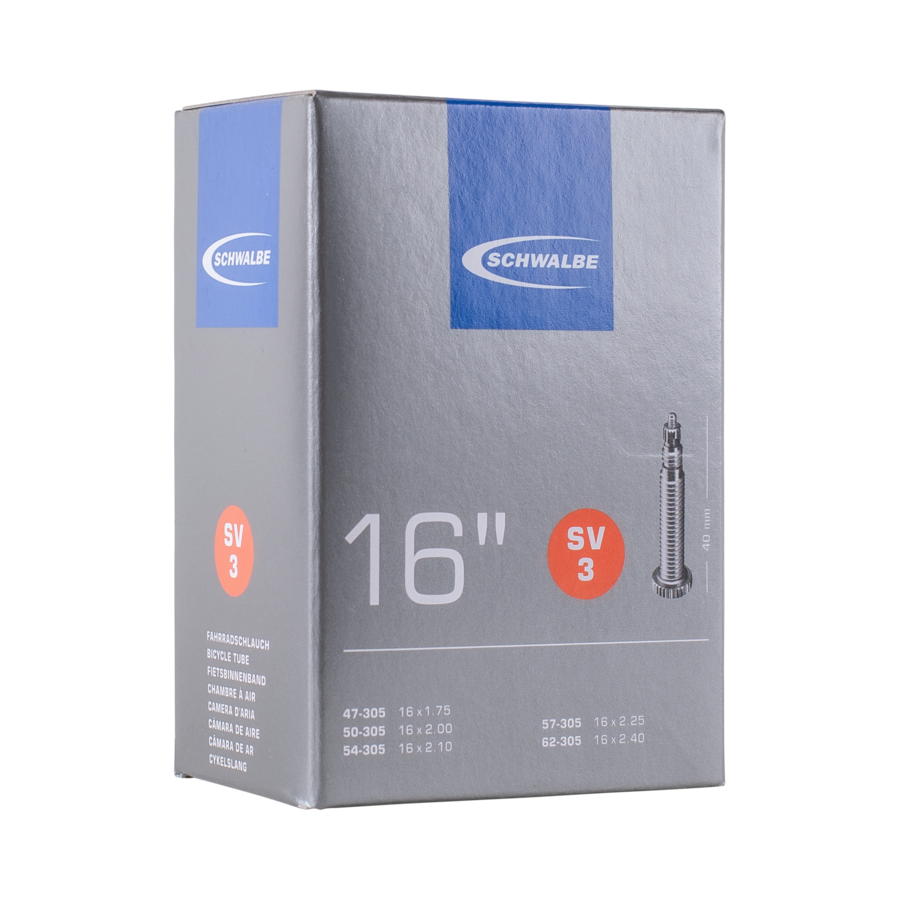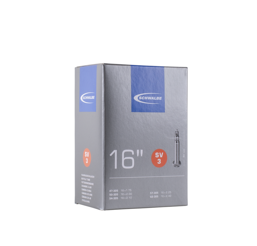 Schwalbe standard inner tube no. 3 for bicycle tires in size 16" inch (ETRTO 47/62-305). Retains air for longer than average. Thanks to the best material quality and uniform wall thickness. Maximum reliability that has proven itself millions of times over.