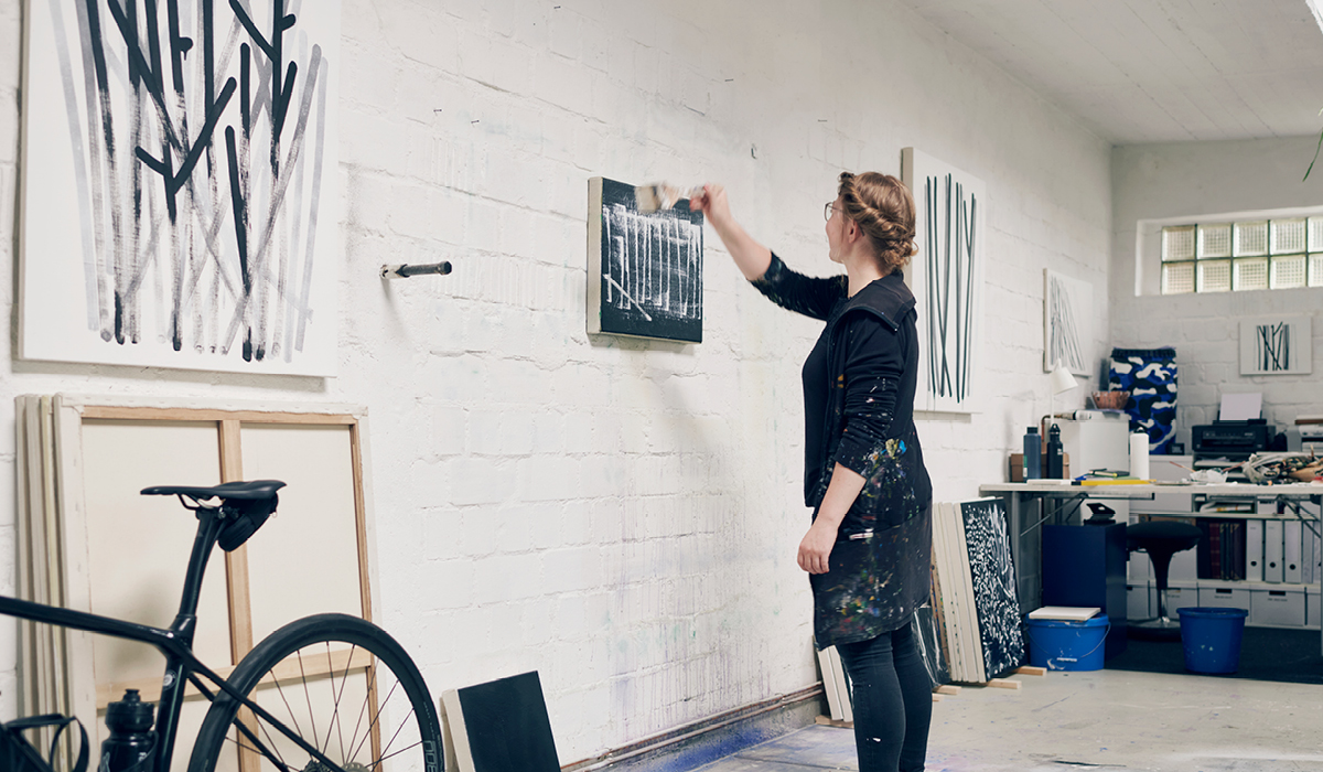 She grew up in the countryside and whenever possible she grabs her bike and rides out into the countryside where she is reminded of her home. She is lucky: on two wheels, from her studio, she can escape the stress and hustle and bustle of the big city in just a few minutes. The surrounding area is an absolute recreational paradise and perfectly suited for tours of any length on a racing bike. It is the fleeting moments while cycling that stimulate her creativity. She speaks of a flow state when everything meshes, of speed, of landscapes rushing by, blurring trees, spots of light on the asphalt, moods that are immediately waiting for her behind the next bend and are already over again with the next blink of an eye. She carries these impressions within her, processes them on the further journey and gives them expression in the encounter with the canvas.