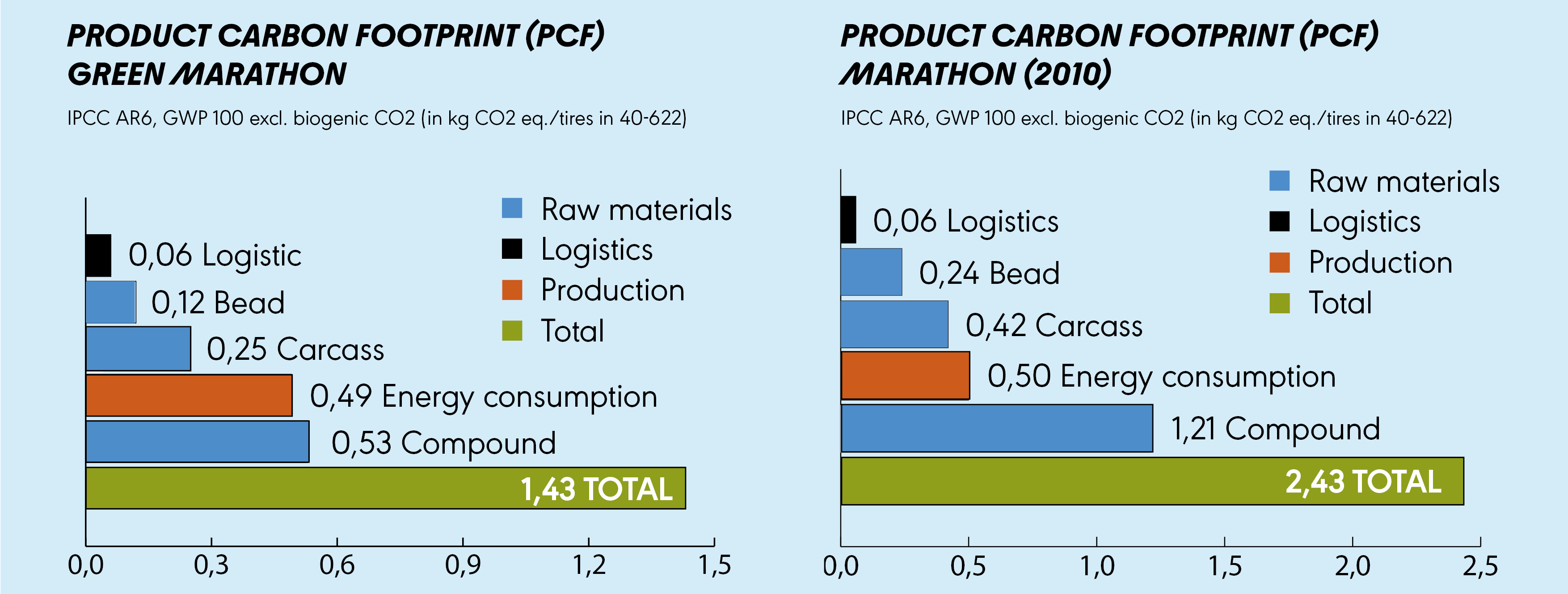 Directly replacing the previous Marathon, The Green Marathon matches it's predecessors performance while also reducing the Product Carbon Footprint(PCF) by 1kg (41%) CO2eq.
