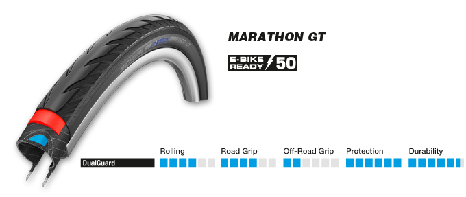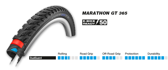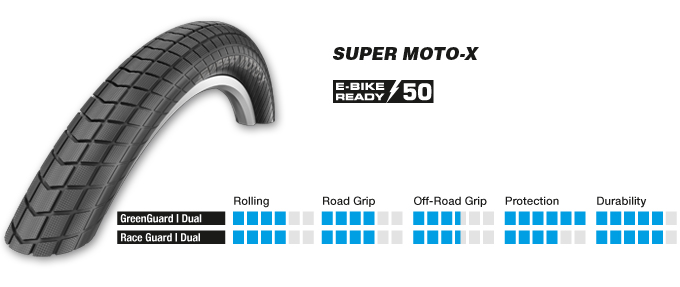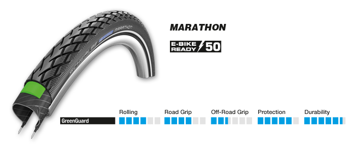 In standard pedelec that have motor assist up to 25 km/h, there is no legal requirement for a special tire. But even with these bikes, loads and average speeds are mostly higher than in regular bikes. daher empfehlen wir nur bestimmte Reifen als „E-Bike Ready“. Therefore we have marked all tires with “E-Bike Ready 25” or “E-Bike Ready 50” which we recommend for the use on Pedelecs.