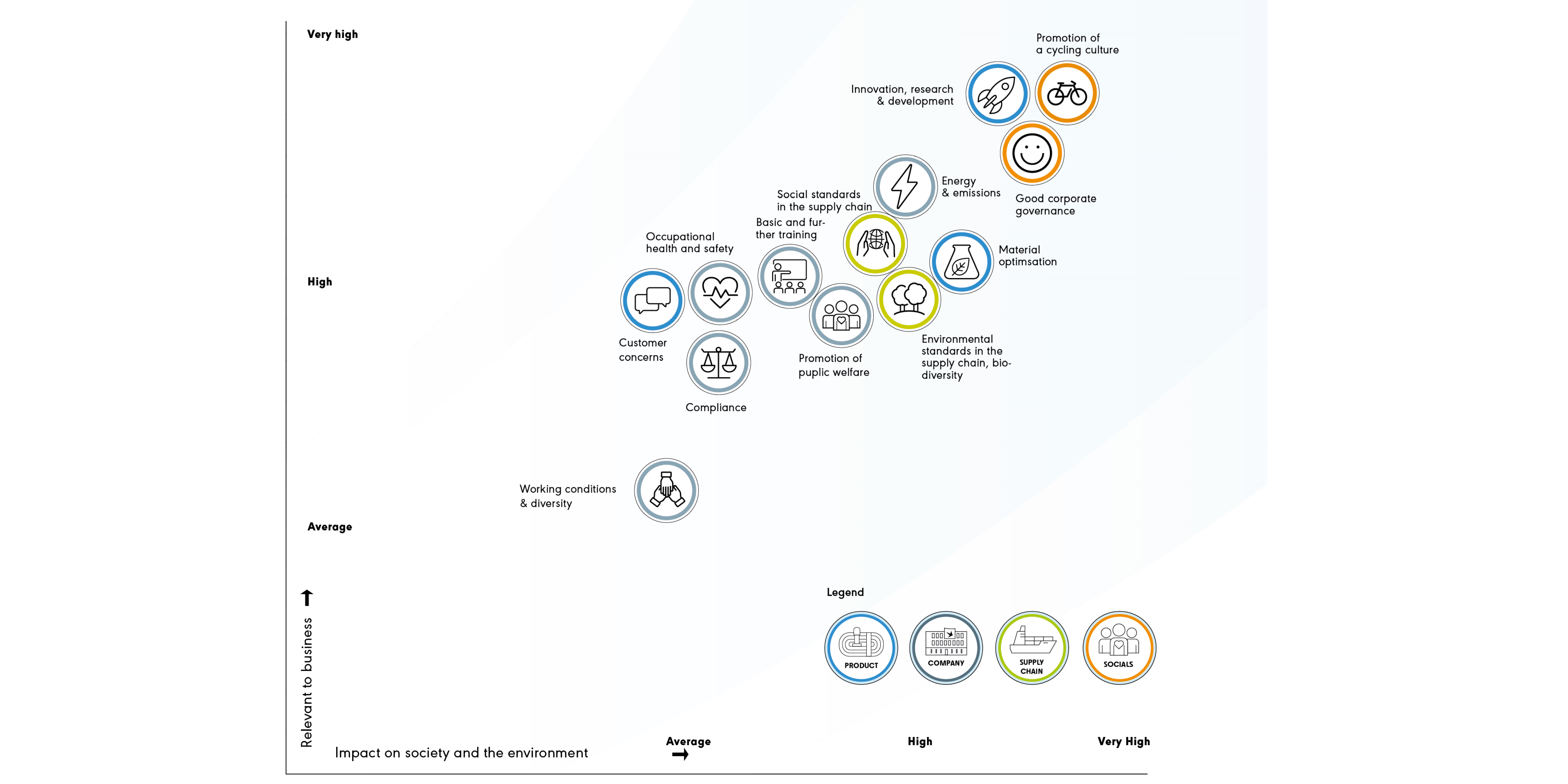 Our materiality matrix shows which topics are of prime importance to Schwalbe and its stakeholders. It forms the basis for our priorities and targets – and the continuous further development of our CSR strategy and CSR measures.