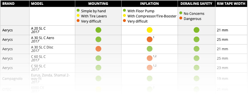 | Size indication (Tire) / Rim width | 15C/TC/TSS | 17C/TC/TSS | 19C/TC/TSS | 21C/TC/TSS | 23C/TC/TSS |