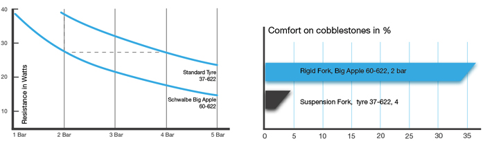 In tests the German Sport University Cologne certified balloonbikes a similar comfort as a full suspension bike. On a test course approx. 25 percent less acceleration at the lumbar spine was measured with Big Apple tire equipment (60-622, 2 bar) than on the same bicycle with standard tire equipment. Compared to that a full-suspension bike could reduce the acceleration at the lumbar spine by 33 percent.
