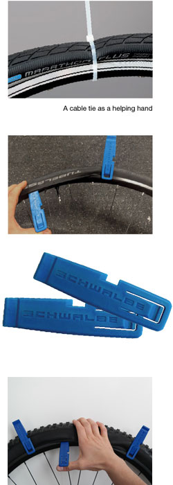 Sometimes the fitting of the narrow versions of the Marathon Plus tire turns out to be particularly difficult. Due to the inherent stress of the tire, the tire slips repeatedly from the drop-center and it is extremely hard to pull the last piece of the tire over the rim flange. A helping hand holding the tire on the opposite side in the dropcenter is very helpful. A cable tie or an old pedal strap could also serve as a helping hand.