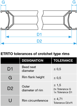 Rims may have a tolerance in diameter of +/- 0.5 mm (D1). In addition, the height of the rim flank also may have a tolerance of +/- 0.5 mm (G). This adds up to a complete tolerance of +/- 1.5 mm in the outer diameter (D2), or of +/- 4.7 mm in the outer circumference. This corresponds to a maximum possible circumferential difference of 9.4 mm between the largest and the smallest rim.