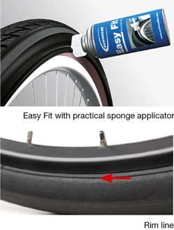 Our assembly fluid, Easy Fit, can be easily applied to the tire by use of the sponge applicator and without using extra tools or dirtying fingers. When inflating, the tire bead then glides easily into the right position on the rim. After approx. 10 minutes the liquid evaporates completely.