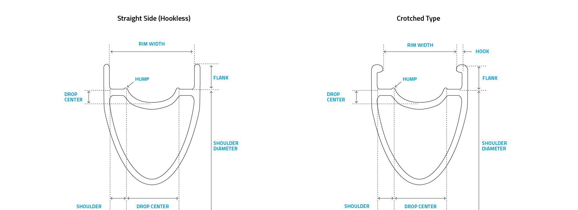 - Hookless rims, also called "Straight Side", are characterized by the fact that the small hook at the end of the rim flank is missing.