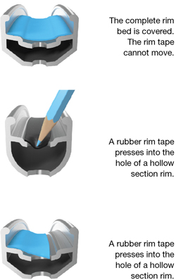 Hollow section rims require the use of special rim tapes such as Schwalbe High Pressure or Schwalbe High Pressure fabric rim tape. Rubber rim tapes are not suitable for hollow section rims, because the inflated tube pushes them into the holes.
