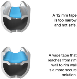 The rim tape must cover the entire rim base. If the rim tape is narrower than the rim base it can slide and expose the spoke holes.