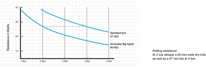 On a completely smooth surface the following applies: The higher the inflation pressure, the inferior the tire deformation and thus rolling resistance.
